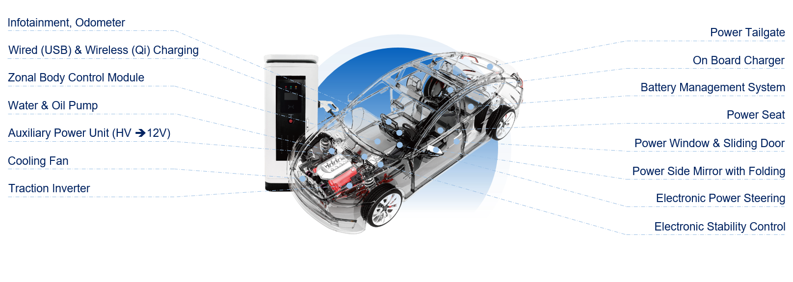 車規(guī)級 MOSFET 通過先進的工藝制程,提供優(yōu)異的電氣特性如 RDS(ON) 和 Qg,非常適合工作頻率較高的開關(guān)電源應(yīng)用。目前產(chǎn)品涵蓋低壓 40 ~ 60V、中壓 100 ~ 150V、以及超結(jié)高壓 650V 以上各類應(yīng)用。