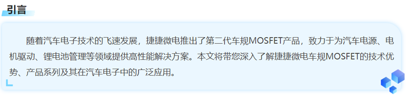 捷捷微電車規(guī)MOSFET憑借其卓越的技術(shù)性能和廣泛的應(yīng)用場景,正在成為汽車電子領(lǐng)域的重要推動(dòng)力。